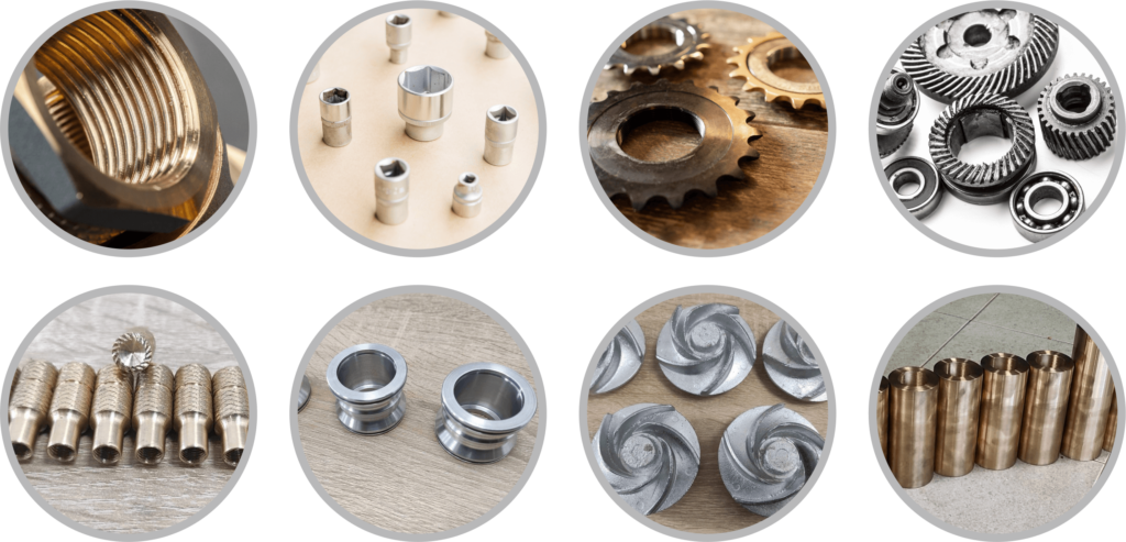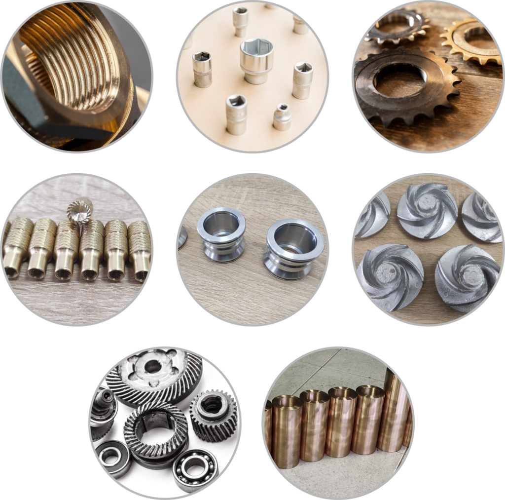Bujes, coronas, engranajes, poleas, impellers, piñones, rodillos, soportes, racores, acoples, bielas, bridas, conectores, cremalleras mecánicas, ejes, espárragos, matrices, moldes, niples, palancas, pernos especiales, piezas especiales y más.
